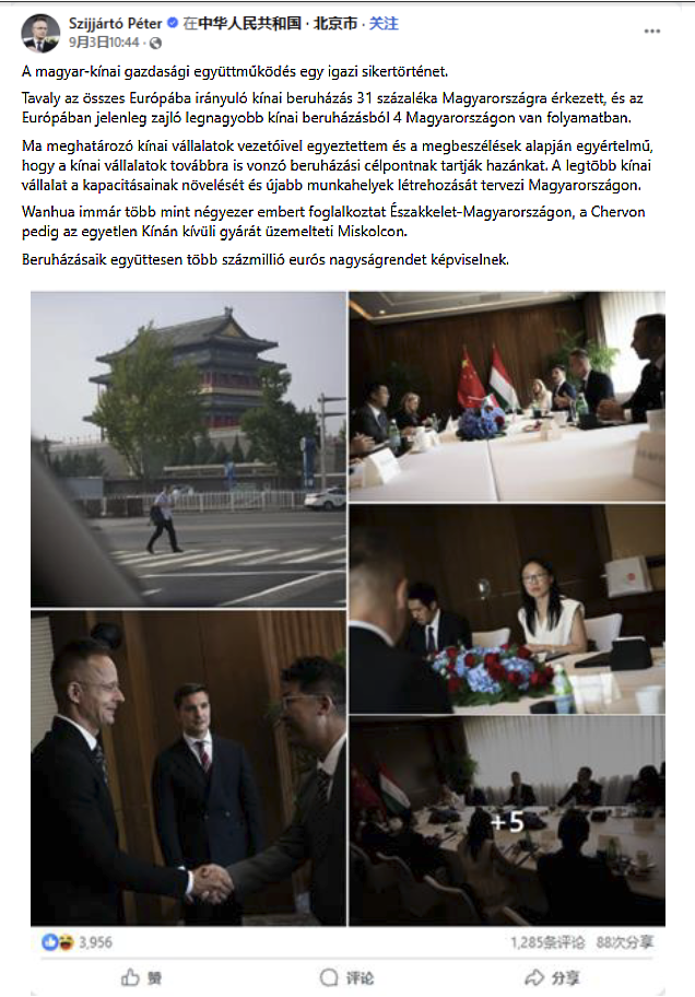 2025年9月3日,匈牙利外交與對(duì)外經(jīng)濟(jì)部長西雅爾多在北京參加完紀(jì)念中國人民抗日戰(zhàn)爭(zhēng)暨世界反法西斯戰(zhàn)爭(zhēng)勝利80周年閱兵活動(dòng)后,同在匈牙利投資的中國主要公司領(lǐng)導(dǎo)人進(jìn)行了會(huì)談。
